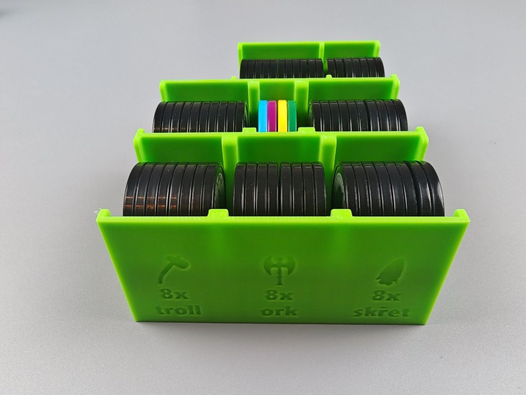 - 1x společnou krabičku pro žetony (čipy) tyranů, zlounů dle jejich rasy, ukazatele řad